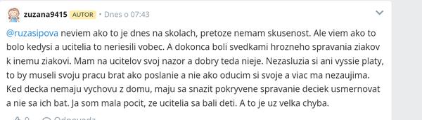 @zuzana76 mali sme v skole aj ucitelku, ktoru deti sikanovali. Ona bola moc dobra, nevedela sa branit. Tak dala vypoved a odisla zo skoly, teraz robi nieco uplne ine. Deti taku moznost nemaju.