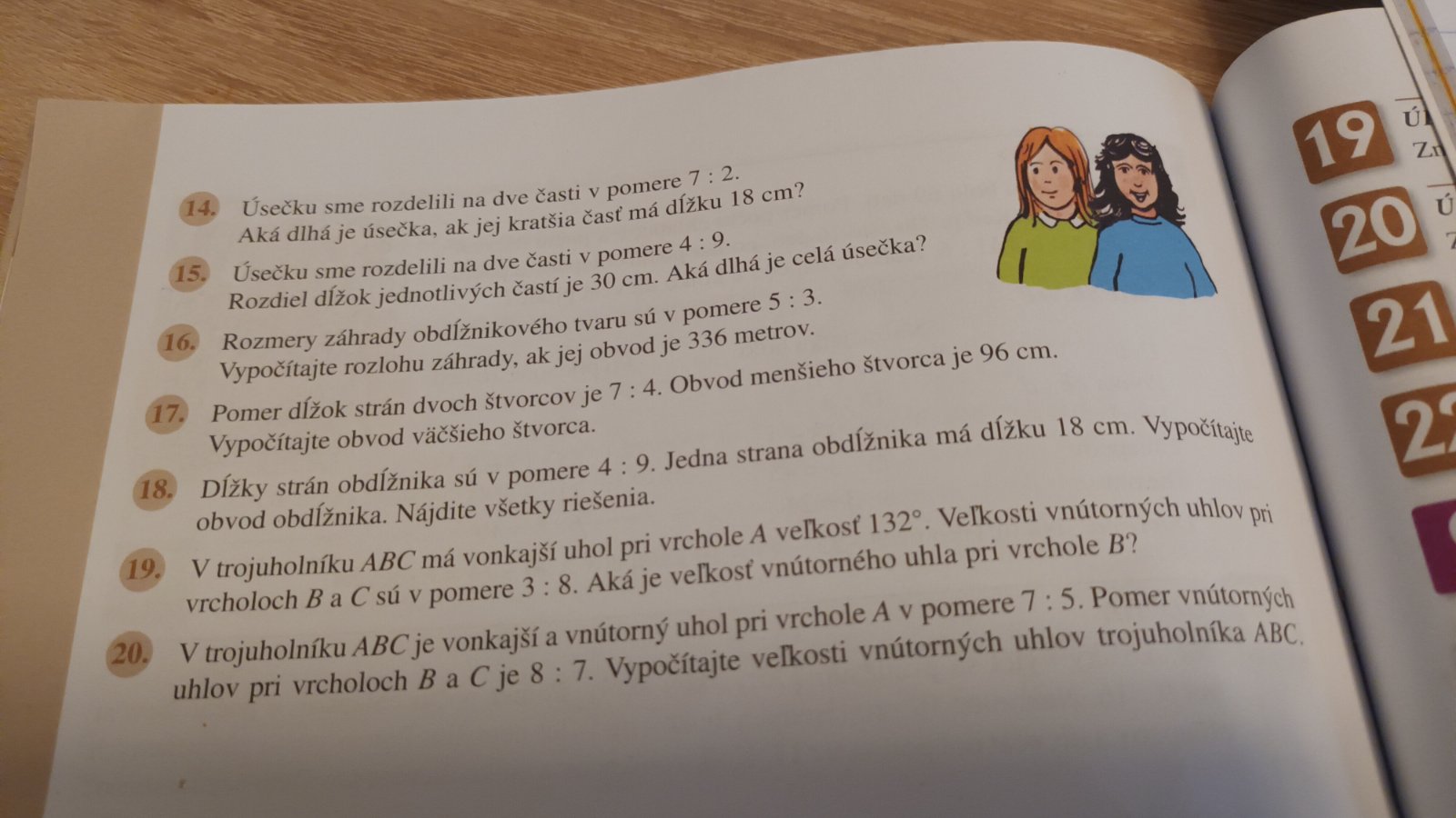 Príklad si nakreslite na papiersúčet uhlov je 180 Stupňov v oboch prípadochTeda 180/12 = 155 x15 = 75 je vnútorný uhol pri bode ANa zvyšné 2 uhly ostáva 105 Stupňov / 15 = 78 x 7 = 56 Stupňpv pri vrchole B7 x7 = 49 Stupňov pri C