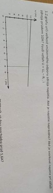 @doma12344 Napatie naprazdno je pri 0A, podla grafu to je 12V. Vnutorny odpor vypocitas podla toho vzorca. Pri 8A je napatie 10V, takze 10=12-Rx8, cize R=(12-10)/8=2/8=0.25 ohm. A pre prud 10A opat pouzijes ten isty vzorec. V=12-0.25x10=12-2.5=9.5V.