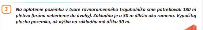 @ivka79 Nakresli si to, nie je to tazke. Ramena su dve, maju rovnaku dlzku a zakladna ma dlzku o 30 m vacsiu a spolu maju 180. Takze 2r+r+30=180. Pismenkom r je oznacena velkost ramena. Ked poznas vysku na zakladnu, tak len dosadis do vzorca na vypocet obsahu.