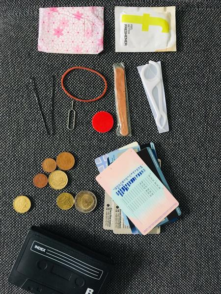 Takze v puzdre (penazenku uz vobec nenosim, pouzivam vzdy len toto) - doklady, karty, zopar drobnych, zubna nit, pilnicek, gumicka, zeton do vozika, ta mini vec na otvaranie krytu na mobile, vlasenka, vlhcena utierka a intimka.