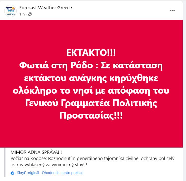 V Grécku hrozí extrémne nebezpečenstvo vzniku požiarov, upozorňuje slovenské veľvyslanectvo. „V súlade s mapou predpovedí nebezpečenstiev vzniku požiarov vydal na stredu 26. júla 2023 Generálny sekretariát civilnej ochrany gréckeho Ministerstva pre klimatickú krízu a civilnú ochranu výstrahu v stupnici alarmu kategórie nebezpečenstva číslo 5 v nasledovných regiónoch Grécka: Attika, stredné Grécko (Viotia, Evboia, Fthiotida, Fokida), Peloponéz (Argolida, Korinthia), západné Grécko (Achaia), Thessalia (Larissa, Magnissia) a centrálne Macedónsko (Thessaloniki),“ varuje veľvyslanectvo na sociálnej sieti. (Aktuality.sk)