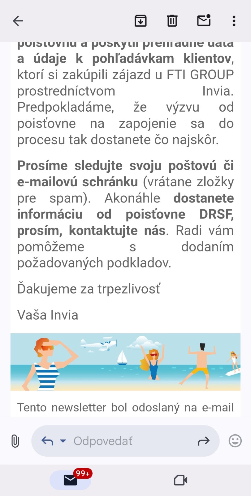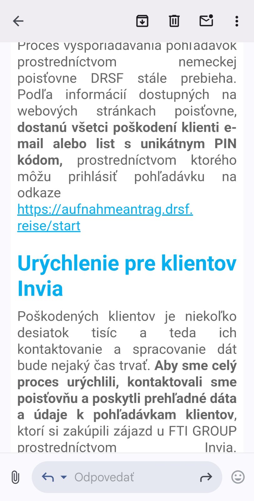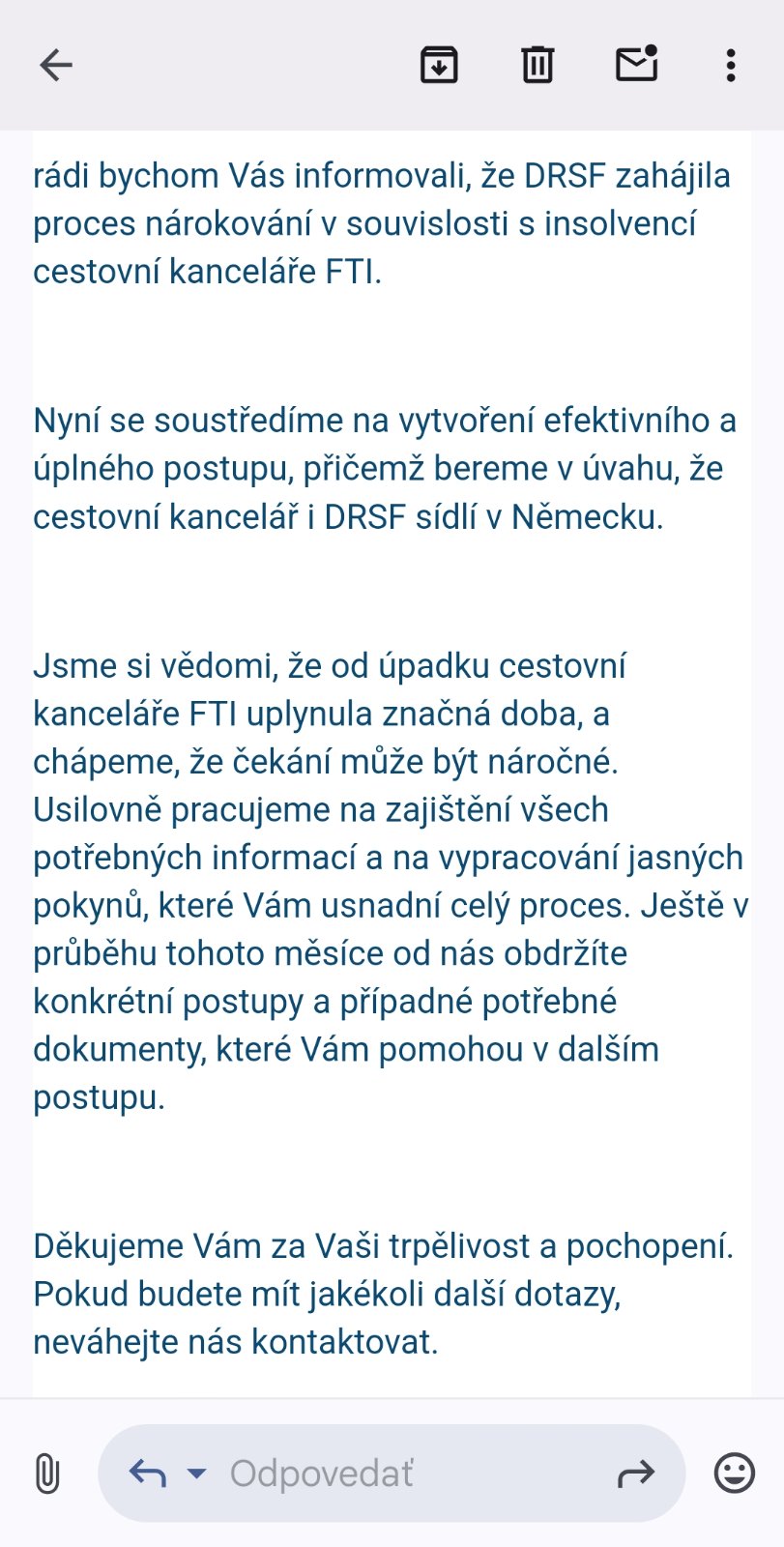 Od 1. septembra začal konkurz FTI, tak neviem ako to bude s klientmi, ktorí mali zakúpenú iba jednu službu a nespadajú pod DRSF a nebola im doteraz vrátená kúpna cena ... , pravdepodobne budú ich pohľadávky už zaradené do tohoto konkurzného konania, tak ako nám uvádzala Invia v maile ohľadne vratiek. Klienti čo zakúpili zájazd budú odškodnení cez DRSF ...
