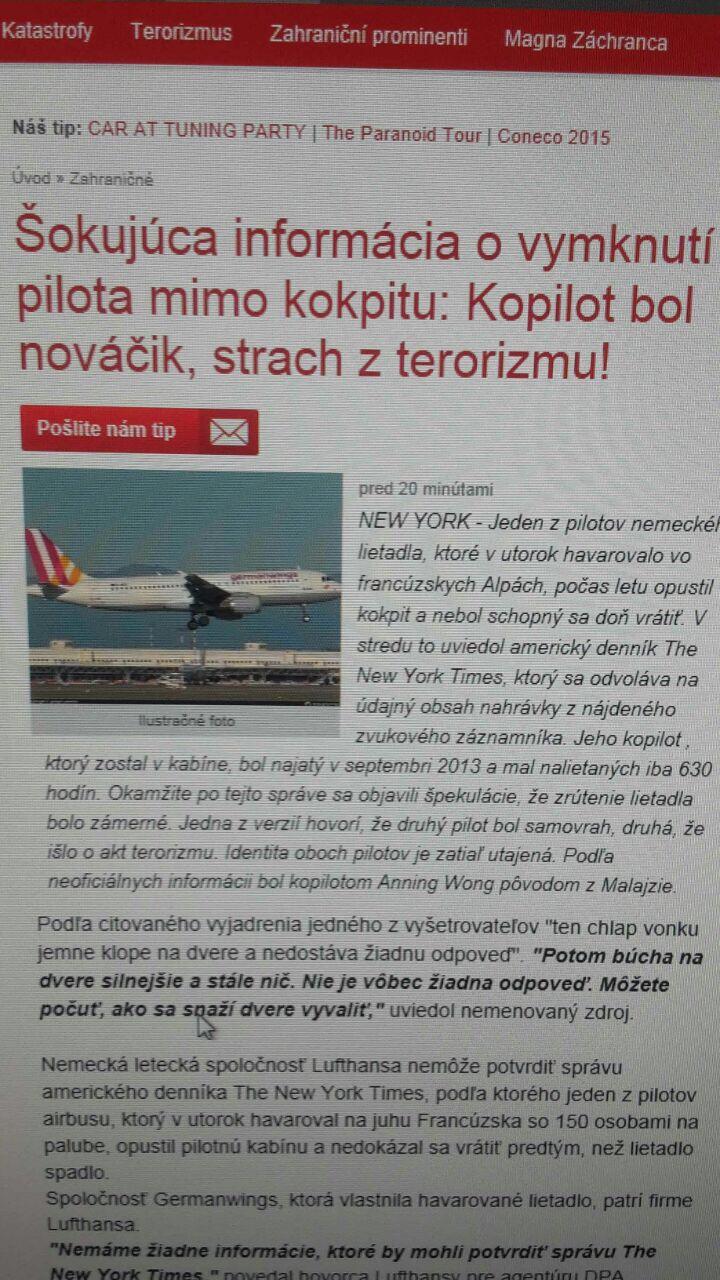 Hovořil jsem včera ráno s jedním pilotem LH ... a sdělil mně, že mnoho pilotů nenastoupilo ráno do práce. ... že bylo interně zakázáno pilotům LH hovořit o čemkoliv co by se týkalo danné katastrofy, pod pohrůžkou okamžitého vyhazovu. ... Normální to nebylo ... Podívejte se na jakékoliv katastrofy z minulosti, vždy byla nalezena těla skoro celá. Kerosín, palivo do letadel, který po jakémkoliv nárazu okamžitě vybuchuje, taky nevybuchl a na nebi nebyl vidět,