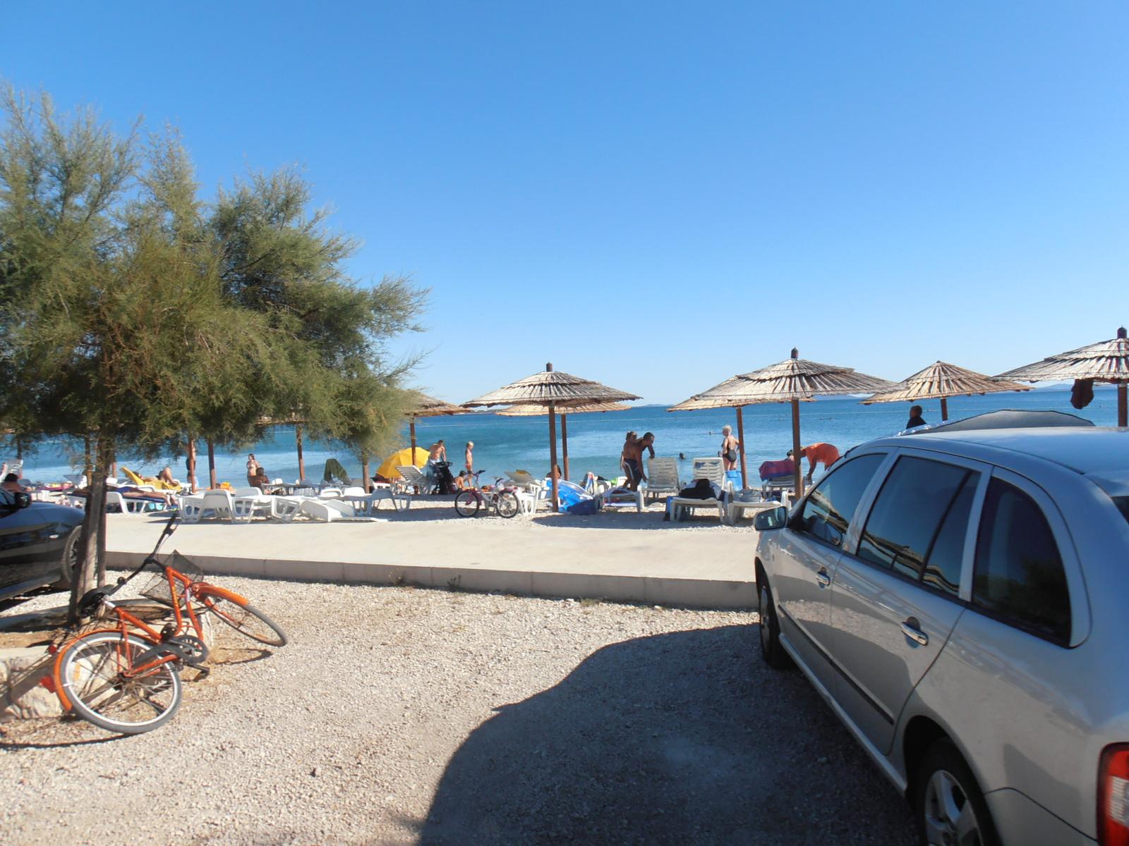 Su tam dve plaze - jedna v zatoke, kde je voda po clenky, deti tam chytaju sietkami krabov, teplucka vodicka. Z druhej strany od mora voda po pas aj 100m od brehu, pre deti idealne, pre tych co si chcu zaplavat horsie, musia ist dlho do hlbokej vody. Necakajte ziadne lehatka a slnecniky na prenajom, vsetko si musite priniest. My sme mali taky plazovy stan, druhy najcastejsi system po zapichnutom slnecniku. Ak aj nebyvate v tejto lokalite, hned pri plazi je parkovisko, za 20 kun na cely den. Plus je tam maly obchodik, kde kupite nieco pod zub, pitie, nanuky. Mestecko je velmi mile, s restauraciami, pamiatkami. Nic velke, ale lepsie ako byt len v nejakom zabavnom turistickom centre.