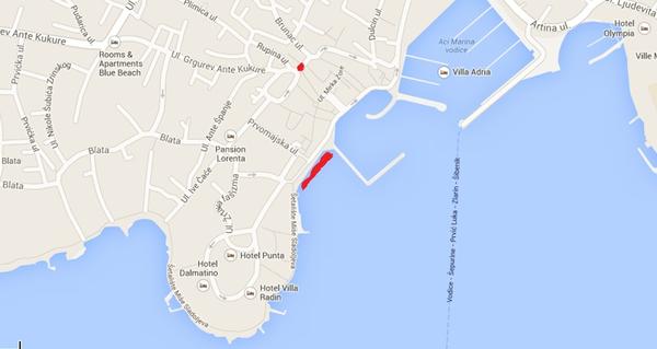 @alami Ahoj my sme boli vo Vodiciach pred tromi rokmi a pokial si dobre pamatám v tom mieste co si oznacila nie je pláž...vedie tade len taká promenáda..akoze kupat sa tam dá, ale boli tadial len také velké skaly...potom uz pláž zacina tam dalej ako je tan hotel punta a hotel dalmatino...to uz je vlastne ta plava pláža