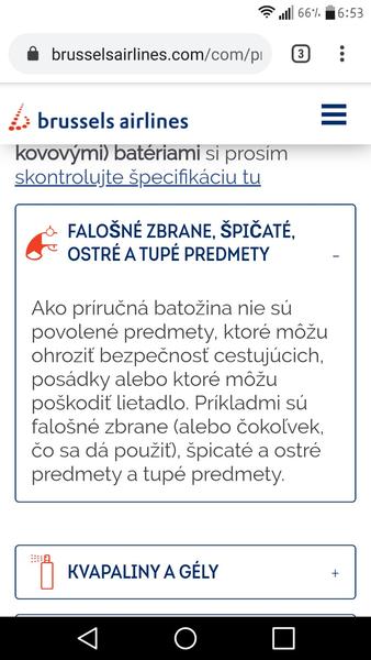 Aby som to nejako uzavrela a zhrnula: možno ste si všimli, že v medzinárodnej legislatíve je definícia všetkých zakázaných a obmedzených predmetov vyjadrená všeobecnou opisnou formou (cit.: "strelné zbrane a zariadenia na vystrelenie náboja") a následne exaktným výpočtom (cit.: "vrátane pištolí, revolverov,..."). Čo v praxi znamená, že mi nedovolia vziať na palubu ani indiánske pľuvátko, aj keď v zozname výslovne uvedené nie je - ale môže to byť posúdené ako predmet, z ktorého vystreľuje náboj. Pokiaľ ide o pravidlá bruselského letiska, rovnako ako na väčšine letísk, aj tu samozrejme platí nariadenie EK. Na stránke Brussels Airlines sa môžete dočítať pokynov - viď screenshot (v SJ). Takže...