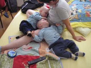 @lusinkaj Maťko je zvyknutý na hluk, on zaspí sám a my tu pti ňom fungujeme, mm pozerá Tv, ja si dorábam diplomku a ťukám...dvojky nevedia sami zaspať, musím ich uspať, spia vedľa v spálni, dostanú fľašku mlieka, ja s k nim ľahnem, medzi nich, šimon ma drží za ruku, Ajo za brucho a zaspia do 5 minút...