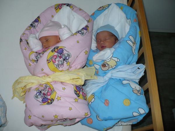 ahojte, tak aj my sa pripajame, uz sme doma 🙂 Baby sa narodili 11.12.2013. Naľavo je Elenka 2970gramov a 53cm, napravo Kristínka 2770gramov a 52cm. Rodila som planovanou sekciou, ukonceny 38 tyzden. Keby nas nenaplanovali tak asi vydrzime aj ovela dlhsie. V nem. som bola hospitalizovana od 35 tyzdna, bez tazkosti. Sekcia bola kvoli tomu, ze Elenka, ktora bola nizsie, bola koncom panvovym.