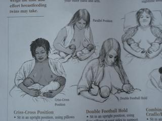 Od začiatku používam vankúš na kojenie. (Mám taký dlhý, v tehotenstve som na ňom spávala.) Zo začiatku som naň nadávala, lebo sa mi z neho zošuchovali. Teraz je to už v pohode. Keď boli malí som ich mala v tých veľkých perinkách. Jedného som mala rovno pred sebou ako keď kŕmiš jedno a druhého nožičkami dozadu "popod pazuchu". Ten druhý mal hlavičku trochu založenú tomu prvému na nožičkách, preto sa mi to dobre v tých perinkách. Aj boli vyššie a nemusela som sa krčiť. A popod nich som mala ten vankúš.Neskôr som ich mala v tých tenkých zavinovačkách a prikladala oboch nožičkami dozadu (myslím, že sa to volá futbalová poloha). Aj teraz ich tak kojím, ale jasné už bez periniek. Sadnem si medzi nich, pripravím vankúš (keď ho nemám pri sebe tak paplón alebo vankúše obyčajné, do takej výšky aby to bolo pohodlné) a vyložím ich hore.