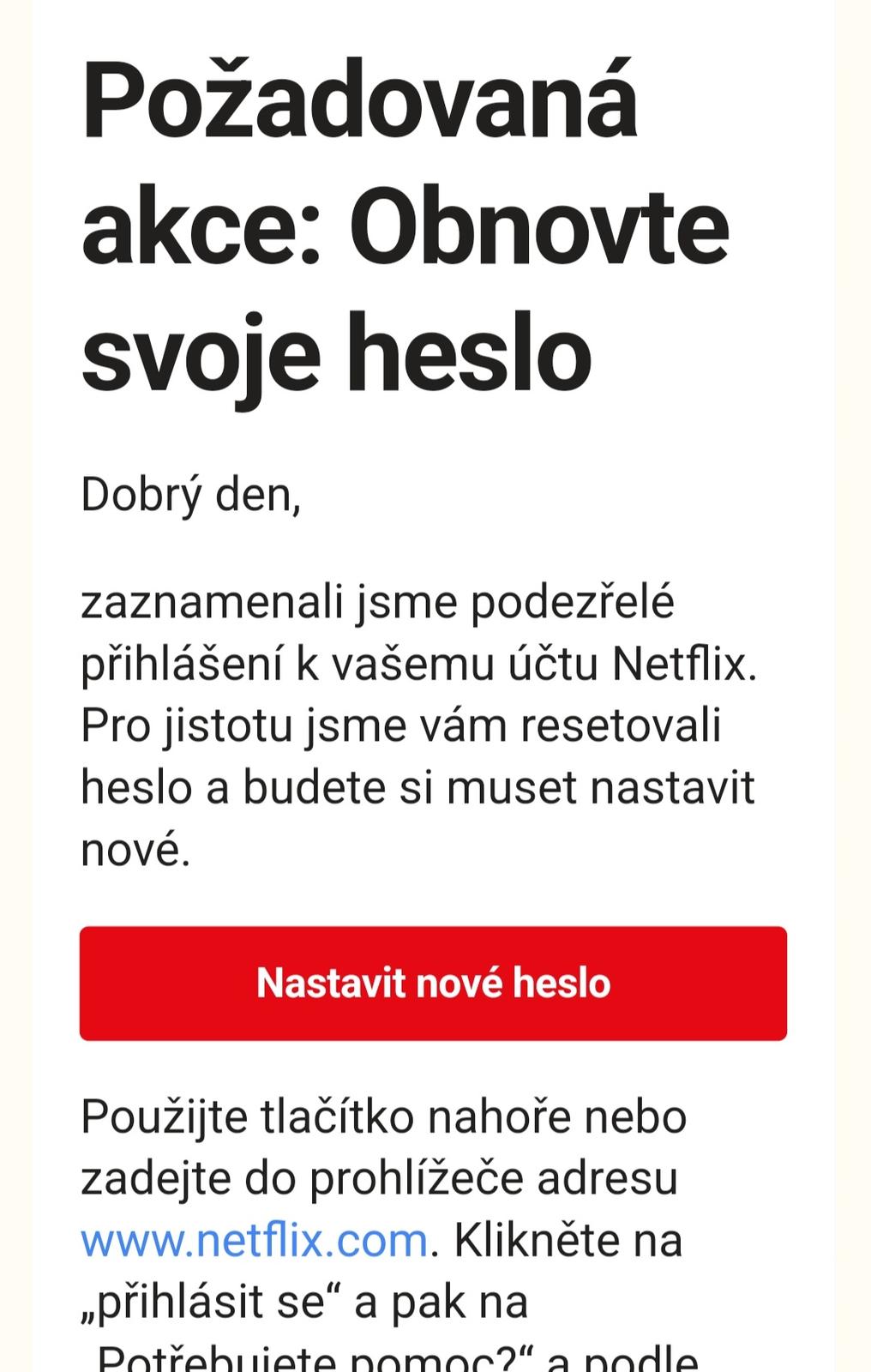no ak sa vam neda prihlasit, je viac nez pravdepodobne, ze to bude pravda 🙂 pozri, kto je odosielatel, ci to nevyzera podozrivo, na ten automaticky link by som neklikala a sla priamo na netflix stranku tak, ze si to sama zadam do prehliadaca a tak zmenila heslo