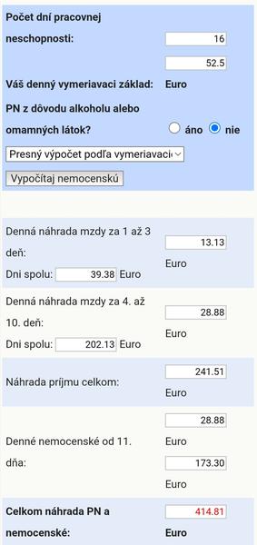 Pravdepodobne ste štátny zamestnanec. Takže predchádzajúci výpočet sa na Vás nevzťahuje. V kolektívne zmluve sú uvedené podmienky pri vzniknu PN jednou z nich je aj to, že od prvého dňa vzniku PN denná výška náhrady príjmu je vo výške 75% denného vymeriavacieho základu a zároveň máte nárok na príplatok k náhrade príjmu vo výške rozdielu medzi funkčným platom po odpočítaní všetkých odvodov a preddavku na daň a poskytnutou náhradov.