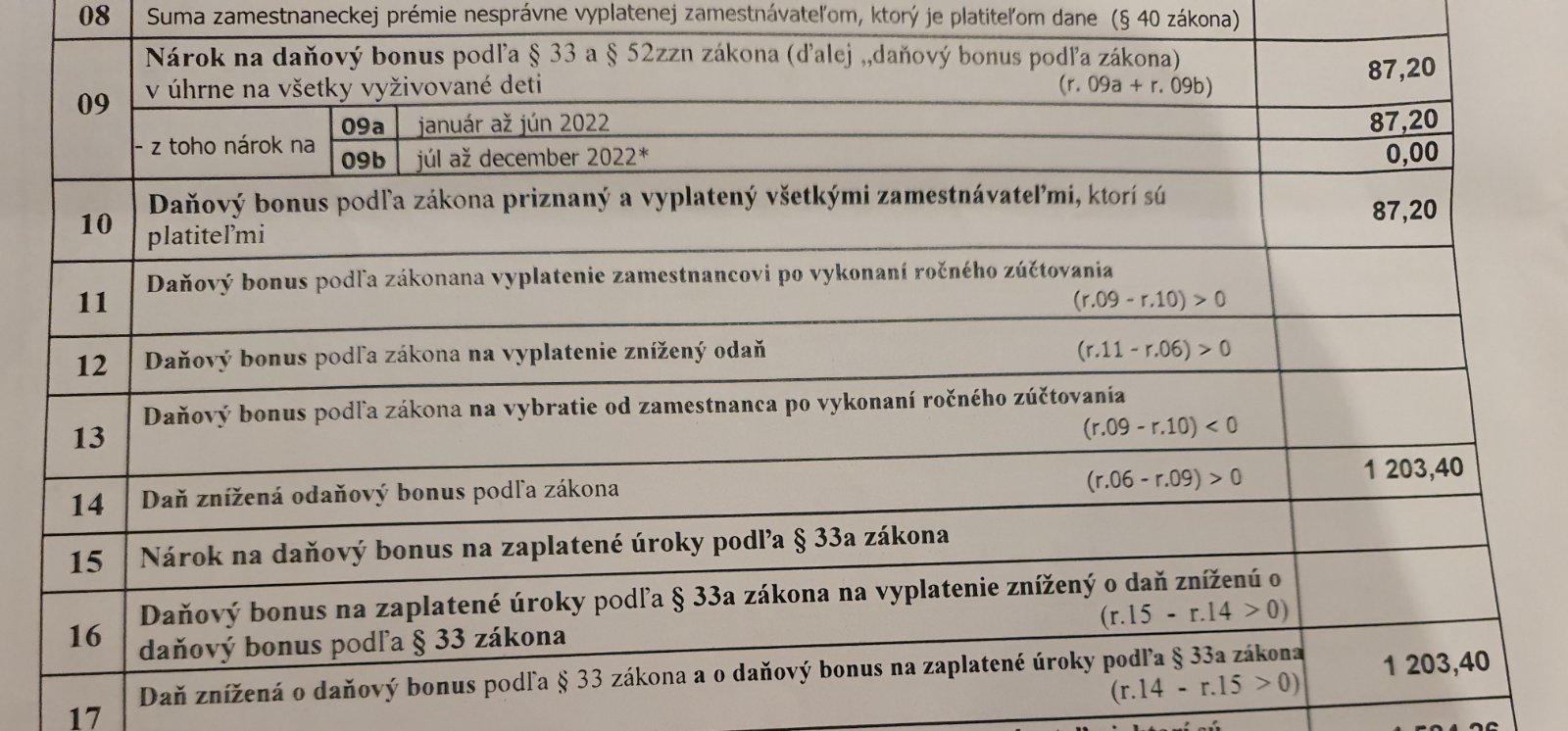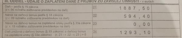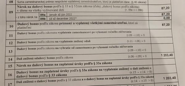 Na tom potvrdení je tiež vyplatená výška daňového bonusu, koľko tam má?