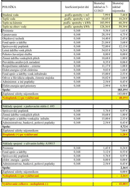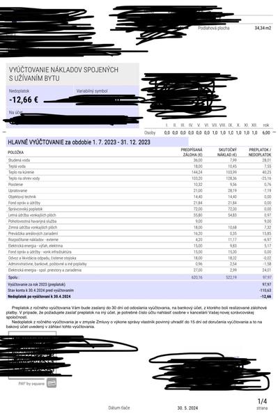 Majiteľka mi na moju žiadosť, že by som chcela vidieť prehľad platieb za jednotlivé mesiace + koľko reálne platí poslala vyúčtovanie nákladov spojených s užívaním bytu, kde nedoplatok robí - 12,66eura (veľké vľavo hore). Ale dole vo fialovom menšom rámiku je napísaný preplatok 97,97eura. Na poslednej stránke je za môj december uvedená nula a za iné mesiace sú tam tie sumy divne nahádzané, zase som sa akurát zamotala. Prikladám to do prílohy, mohla by som ešte poprosiť, kto tomu rozumie, či je to ok? Ja naozaj absolútne.