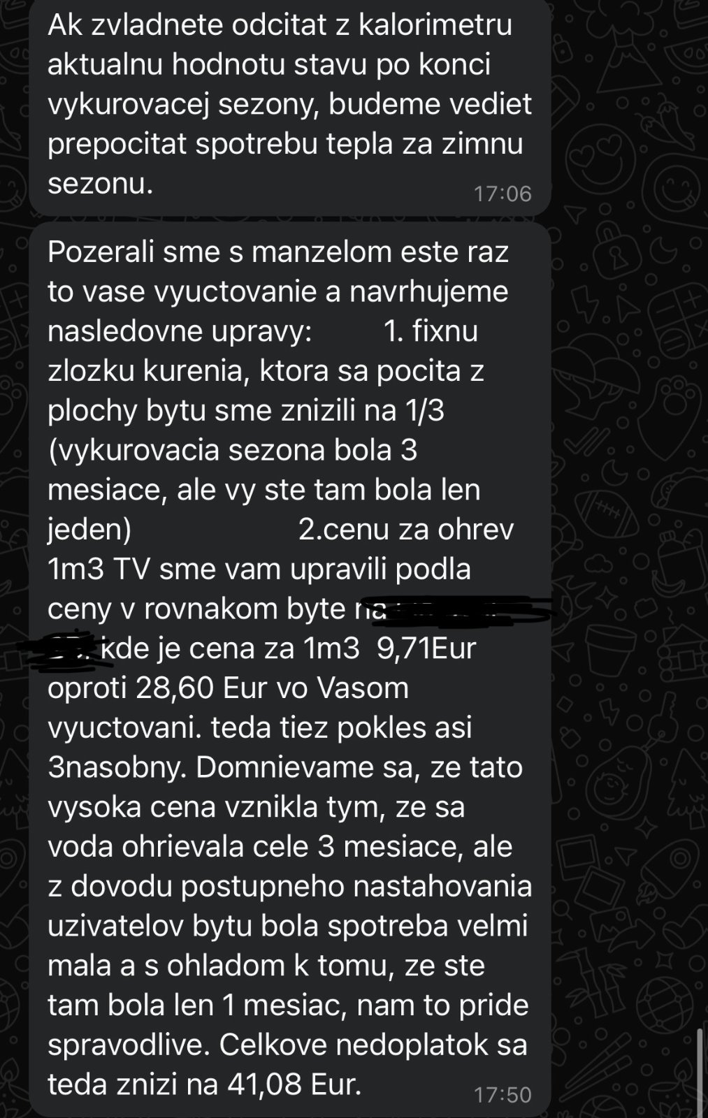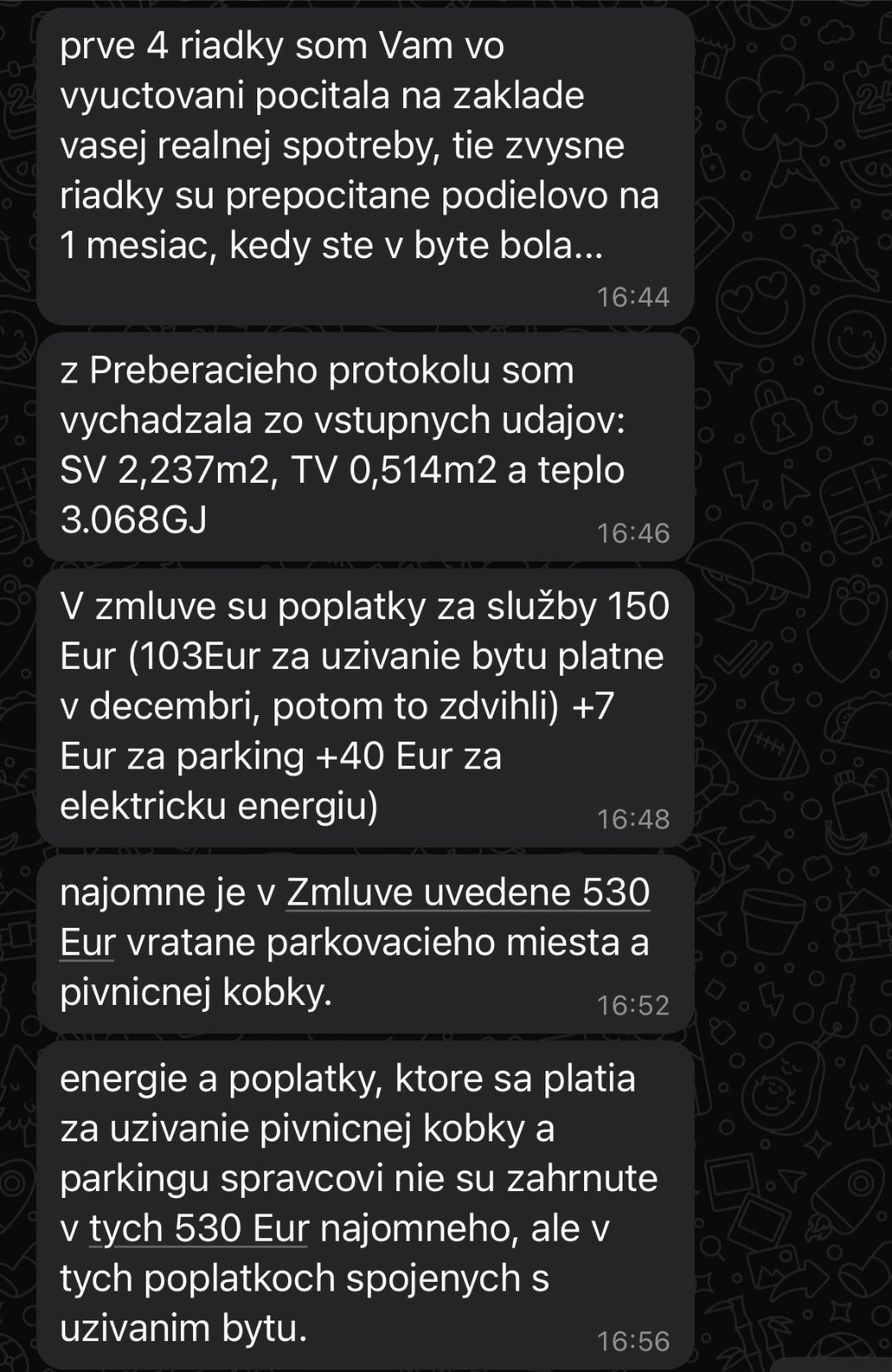 Prikladám aj komunikáciu s majiteľkou, nech nemusím citovať, nakoniec mi z ničoho nič ten "dlh" stiahla na 41,08eura. Príde mi to maximálne čudné, že zrazu aký skok a síce som vnútorne vďačná (ešte som jej ale neodpísala), nechcem na ňu pôsobiť nevďačne, no úprimne nerozumiem, že prečo mám vôbec niečo platiť, keď z tohto modrého vyúčtovania oni dostali preplatok a tam hore tých 12eur keby pýta, tak síce stále nerozumiem, ale to zaplatím.