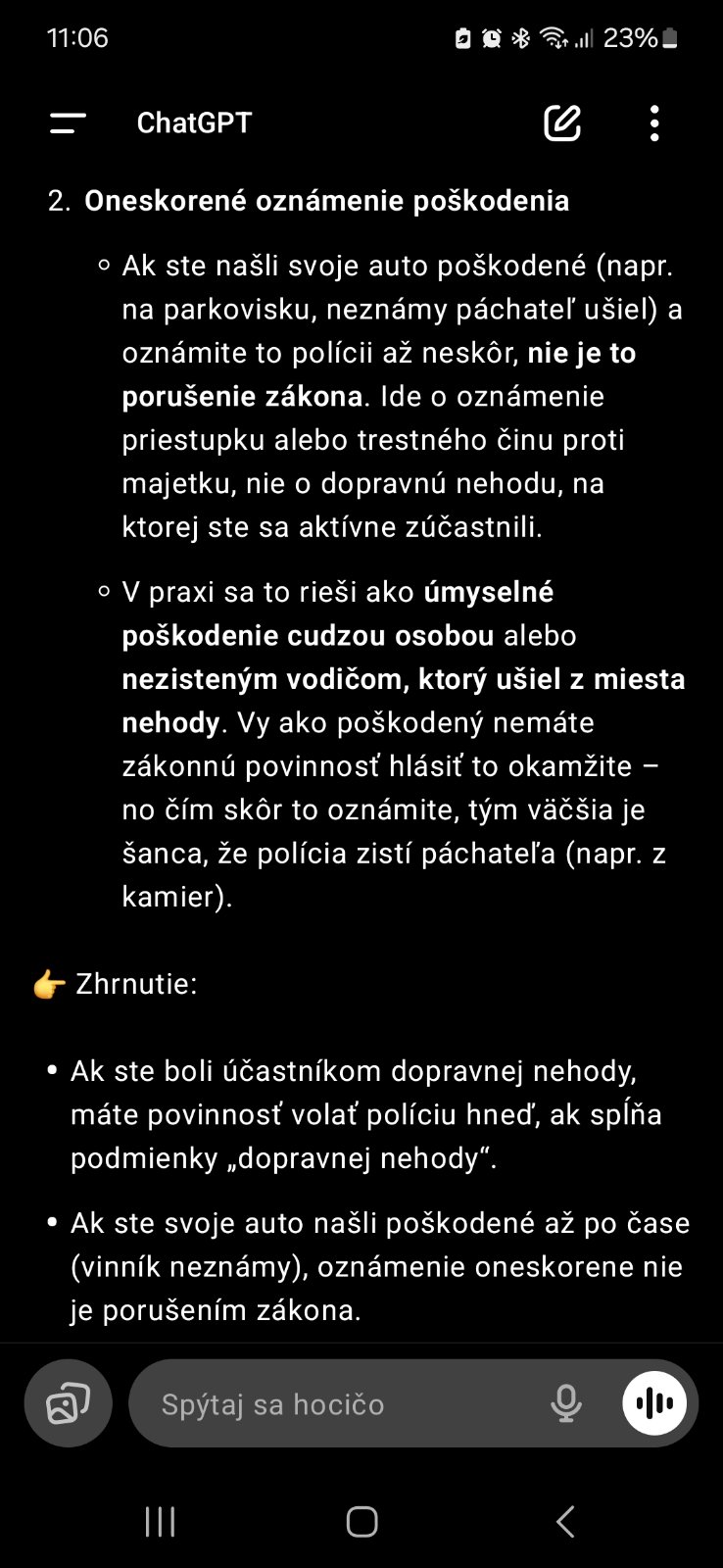 Ja sa budem len opakovať, ale AI v práve je často dosť mimo. Už len logicky musí byť aj laikovi jasné, že bežné kolízie sú nezavinené. Ale tu sa dozvieme múdru radu, že sa to rieši ako úmyselne poškodenie. A len tak pomimo, práve skrz podobných škodových udalostí, z ktorých sa stali dopravné nehody, sa dokonca menil zákon, pretože poškodení sa nevedome udali, a tak museli podľa vtedajšieho zákona dostať trest ako vinník, ktorý však zostal neznámy.