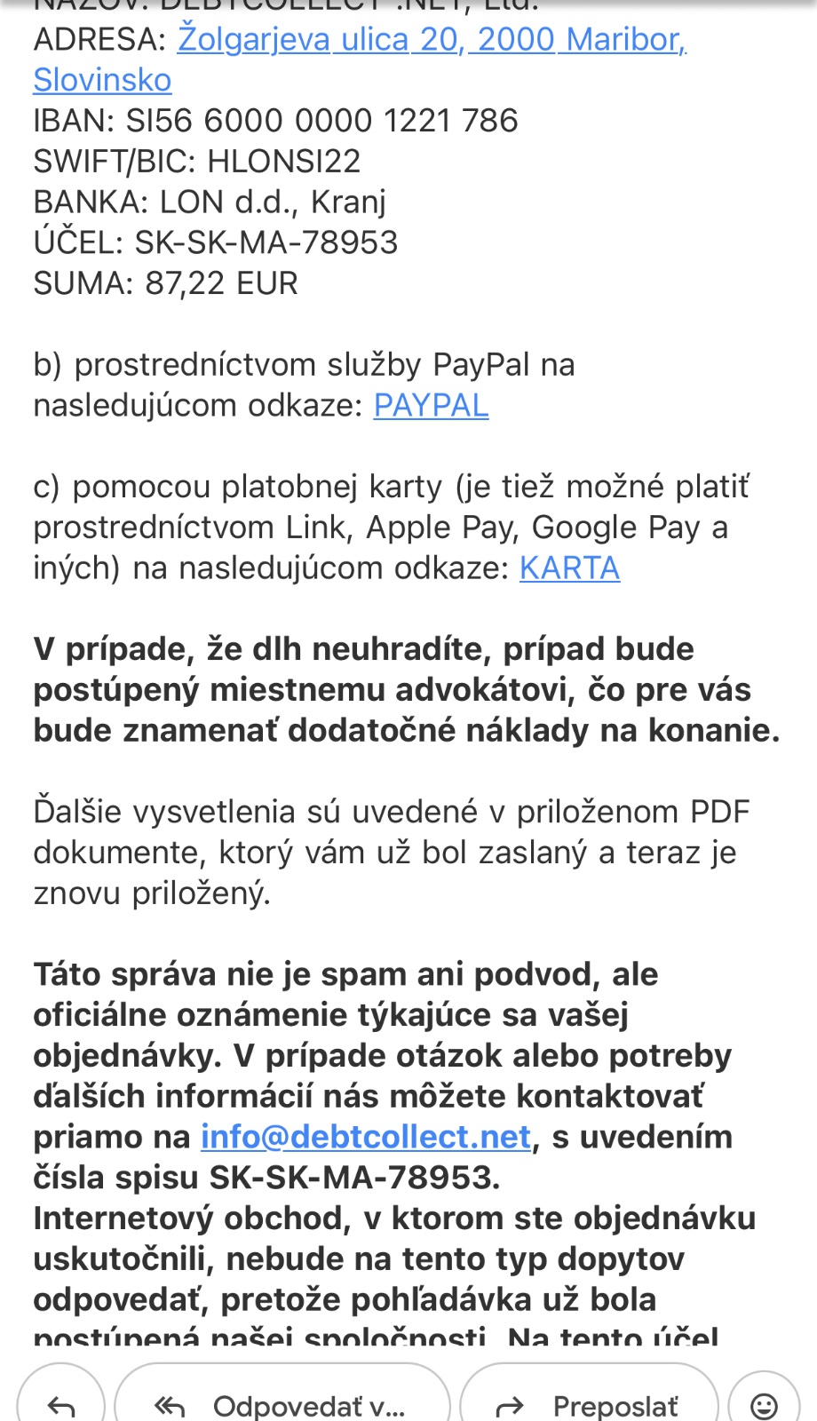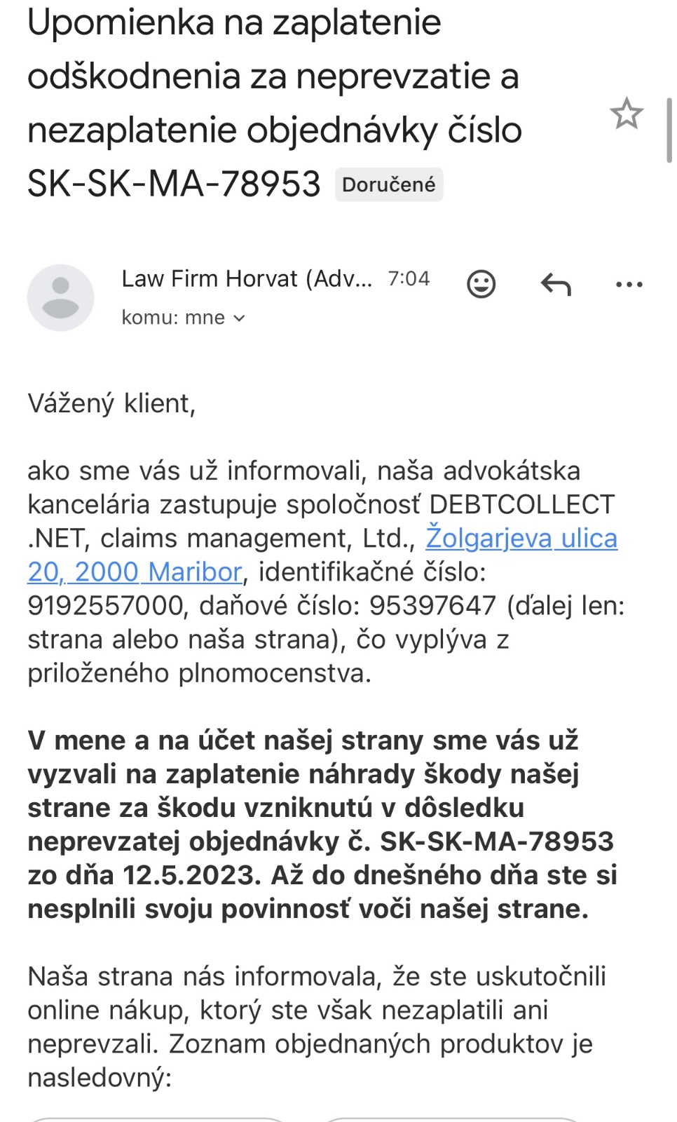 Ahojte, dnes mi prišiel email od istej vymáhačskej spoločnosti zo Slovinska,kde odo mňa žiadaju resp. vymáhajú 90€ za neprevzatie dobierky kde mali byť legíny,ktoré mi mali udajne prísť ešte v máji 2023.Vraj mi už posielali viacero výziev a ja som nereagovala!! Absolútne netuším o takejto dobierke, dokonca aj veľkosť je iná akú používam ja. Hrozia mi súdom ak to neuhradím. Ako by ste to riešili vy? Ďakujem všetkým.