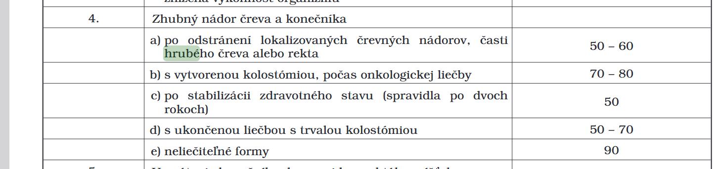 Ahojte vie niekto podľa čoho sa vypočitavajú percenta invalidity ? Pretože môj manžel je po odstránení zhubného nádoru v hrubom čreve a chodí na chemoterapiu. Žiadal o TZP preukaz a o invalidný dôchodok a neschválili mu ani jedno, zatiaľ čo moja kamarátka ma elergiu na lepok a jej vypočitali 70 percent invalidity. Pričom môj manžel má rakovinu 3 stupňa podľa správ od lekárov a neviem teda ako to funguje.