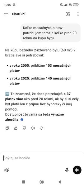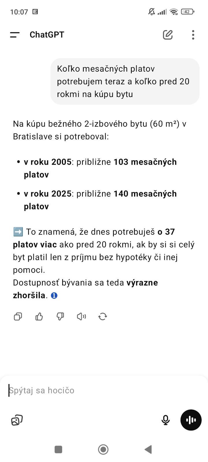 @oriesocek ja zaroven nejdem tvrdit, ze ste to mali jednoduche, byvanie vzdy bolo drahe a clovek sa musel pred kupou vlastneho byvania uskromnit a zarabat a setrit. Problem je, ze prijmy rastu pomalsie ako ceny nehnutelnosti a kazdy rok je to viac a viac nedostupne. To nie je moj vymysel, toto su fakty a statistiky. Ked niekto nema pomoc od rodicov, sam si financuje VS, a musi byvat v najme kym nasetri na vlastne byvanie, tak je takmer nerealne kupit byt v hlavnom meste v 26tke napriklad. Nehovorim ze je to nemozne, ale ze je to sakra tazke. A proste su ludia ktorym sa to podarilo, casto vdaka tomu, ze mali pomoc od rodicov, alebo mohli byvat u rodicov a setrit, a tvaria sa, ze za to moze ich sikovnost. Pritom zarabam o dost viac ako Ti “sikovni” ludia v mojom okolo, ktori sa popri juniorskych poziciach kupili byt, a tvaria sa, ze to je ich sikovnost. A ano, mozno zavidim, ale asi si nikto neprizna, ze mu externe faktory ( ako je napriklad kup bytu pred 10-20 rokmi, pomoc od rodicov, kupa bytu v malom meste atd.) proste hrali do karat.