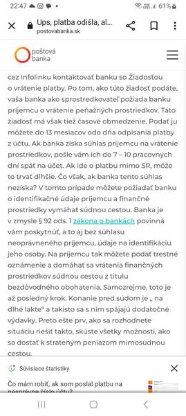 @sasa1310 toto som uz riesila,pisem to v zadanom prispevku.Asi 5 rokov dozadu,tuto reklamaciu,zbytocne,akurat som prisla o dalsie peniaze. Vsak to iba banka ako pisete vyzve danu osobu peniaze vratit a ked nevrati nic sa nedeje,ziadny postih ani nic,na co by vracal. To mozem aj ja v spravach ho vyzyvat nech vrati,to mam to iste. Vtedy som si ale od toho vela slubovala,uz by som 2x do toho nesla.