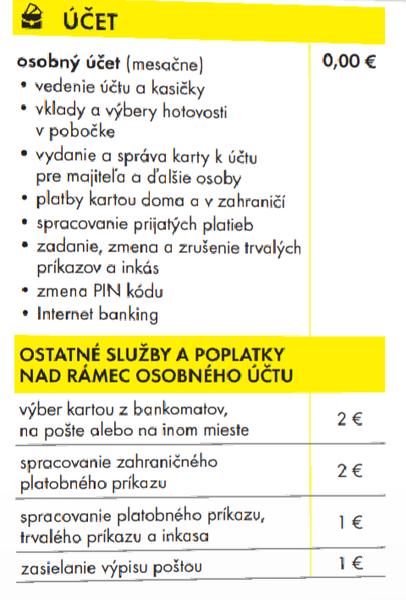 @prispievatel spomínaná banka ma parádny účet a potom tzv. osobný účet, ten som v mojej odpovedi nazvala obyčajný. Parádny je spoplatený, je v te cene viacero služieb, osobný je bez poplatku a teda množstvo ďalších služieb je spoplatnených nad rámec účtu.