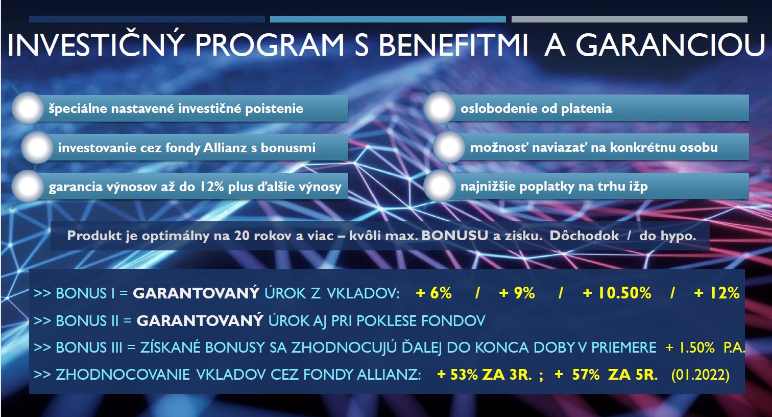 Súhlasím z názorom že investovanie bude ta najlepšia cesta pokiaľ je plán investovať peniaze dlhodobo. Zlato je dobrý uchovávateľ hodnoty ale ako investičný nastroj na dlhy horizont pomerne neprakticky. IŽP alebo aj investične životne poistenie je zaujímavé pre samotne poisťovne pretože si dokážu zarobiť na zbytočných poplatkoch ktoré Vás oberajú o zisk. Každé investovanie zo sebou nesie určite rizika a nikto vám nemôže garantovať vynos takže by som bol opatrný pri takých ponukách.