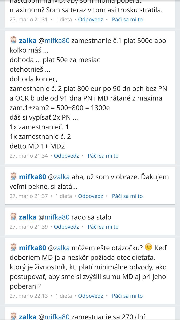 @zalka Ahoj Zalka.. prosím ťa, mám na teba prosbu- otázku... známa pracovala 5rokov v jednej firme - plat 900e, od januára bola na PN kvôli rizikovému tehu, bohužiaľ v 5.m. potratila. Do konca mája jej trvala PN, teraz je v júni na dovolenke - mesiac.. od júla chce dať výpoveď.. chcela by poradiť v materskej - na bábu môžu už znova pracovať. Keby sa im to podarí v auguste, septembri, mala by nárok na MD keby ide od augusta na SZČO? a ako by jej vyšla MD? Z čoho by sa jej rátala? Musela by si platiť DNP?