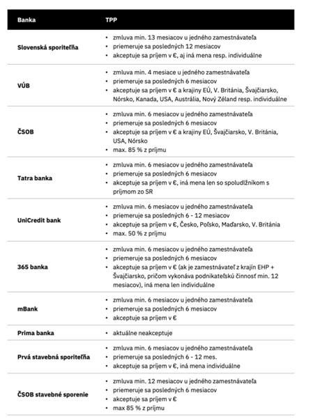 pokial dobre viem, len 2 banky akceptuju zahranicny prijem (mozno to boli uz spomenuté banky, to uz presne neviem. Len teda aj ,%strop maju nizsi...okolo 60-65%, nie 80 ako tu pracujucim. Len teda mohlo sa to trochu menit, tiež mam cca 3rocne info