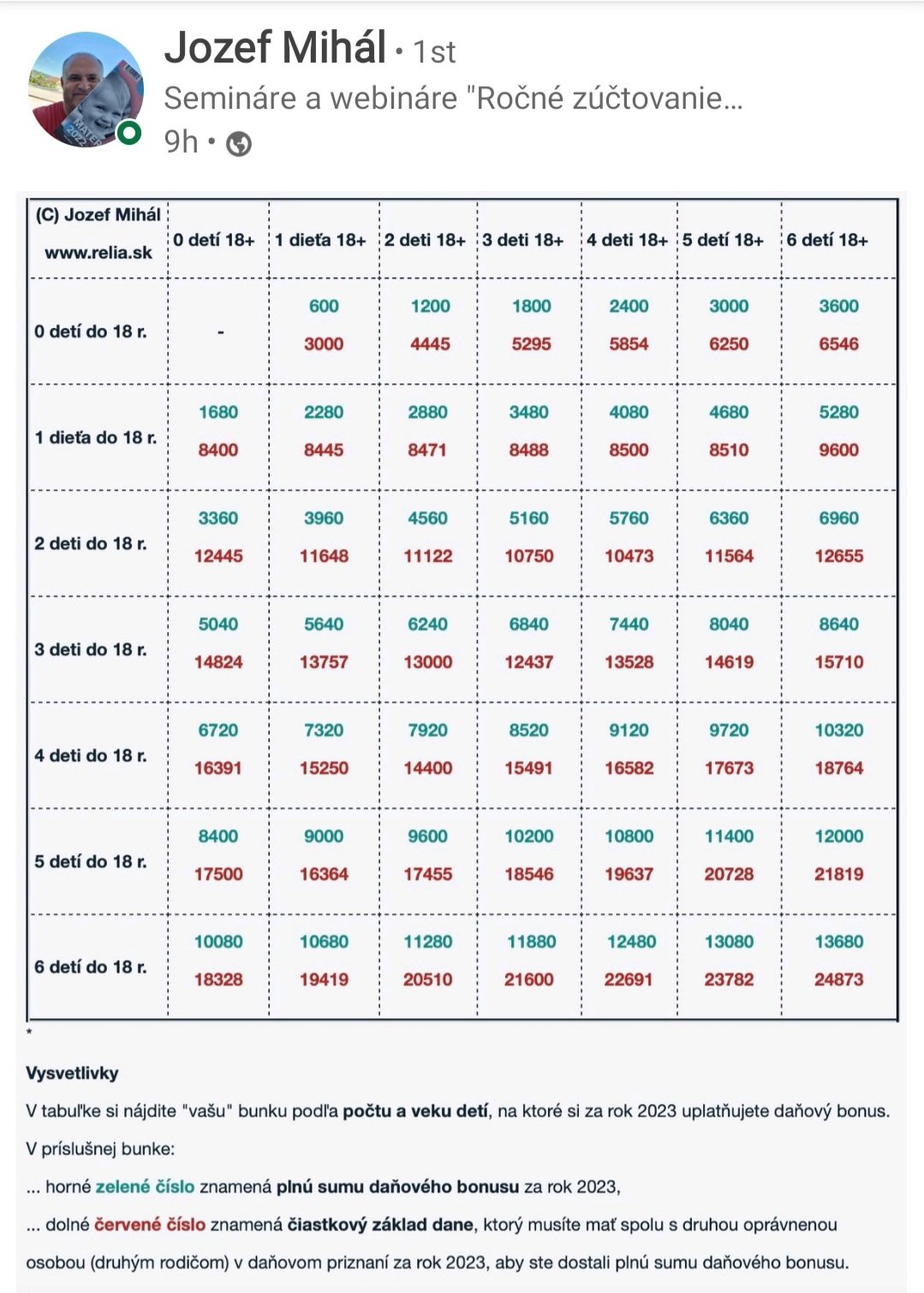@danuska1908 prosím vás môže aj manžel požiadať o doplatenie daňové bonusu, keď ma príjem zo zahraničia?na SR má nulové daňové.Nikto mi nevie poradiť.Dakujem