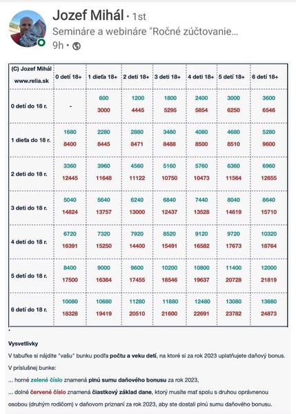 @danuska1908 prosím vás a ak ma manžel hrubú mzdu 1250€ a mame deti co veku 8,11,a 18(tie mala dcéra v apríli),tak na akú sumu daňového bonusu mame nárok, keďže si ho dávame vyplácať raz ročne. Ďakujem