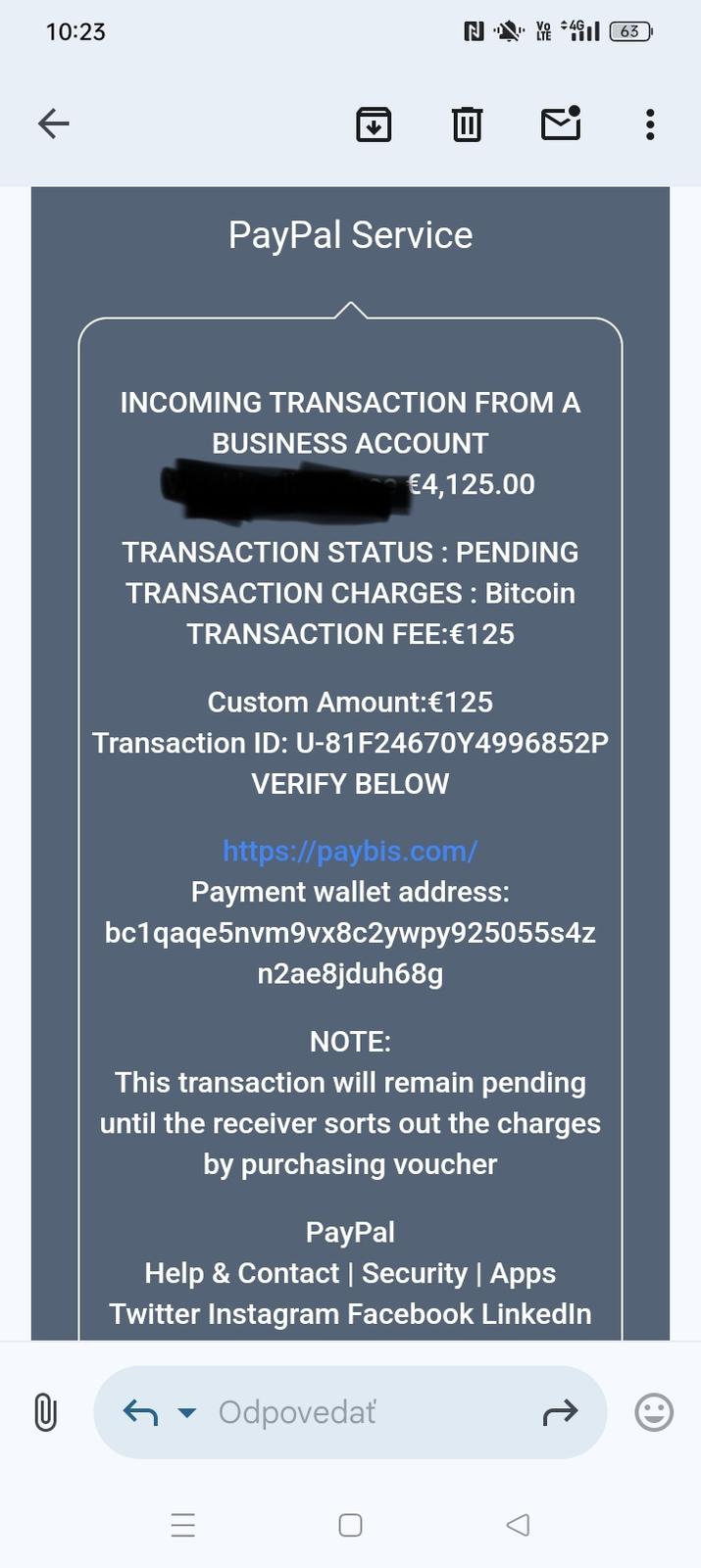 Platba ti mala prísť v bitcoinoch? Podľa mňa je to tiež podvod, lebo od teba požadujú aby si si kúpila nejaký voucher na dokončenie transakcie. Ak bežne neplatíš za to, že prijímaš peniaze, tak by si mala spozornieť. Dávaj si pozor a nikomu nedávaj detaily k tvojmu PayPal účtu, najmä ak ho máš naviazaný na kreditku, alebo konto v banke. A na záver, ak si chceš overiť, či naozaj ide o PayPal transakciu, tak sa prihlás do svojho účtu a over si to tam. Nerieš to cez maily.