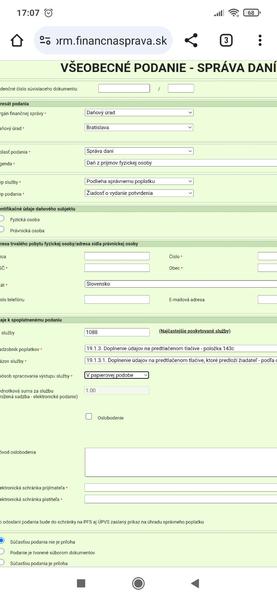 @lauritka treba podať len žiadosť elektronicky. DU toto tlačivo má. Vytlačí ho. Vo všeobecnom podaní treba zadať ID služby 1088 a nie 1058, to by bolo zle. Potvrdenie je potrebné predpokladám pre banku. Po odoslaní žiadosti sa v prijatých dokumentoch vygeneruje platobný predpis na 1,00 správny poplatok, ktorý treba uhradiť na c.u. a hlavne variabilný symbol