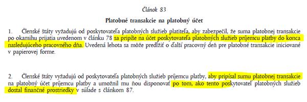 a príjemcova banka musí pripísať platbu v ten deň kedy príde, nesmie čakať do ďalšieho dňa