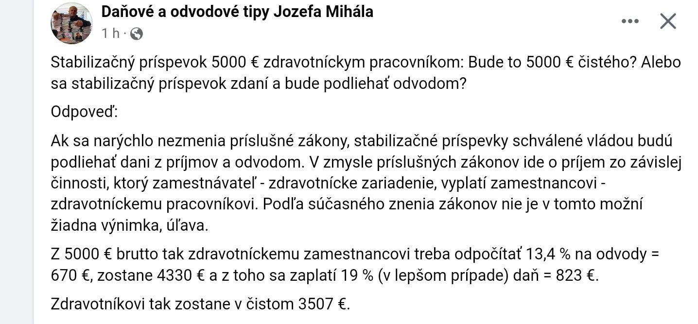 Ahojte, prosím Vás o pomoc ak niekto sa význate. Schválili nám stabilizačný príspevok vo výške 5tisic eur. Niekde píšu, že sa to zdaní a nebudú sa z toho strhávat odvody. Niekde čítam, že aj odvody sa budú.