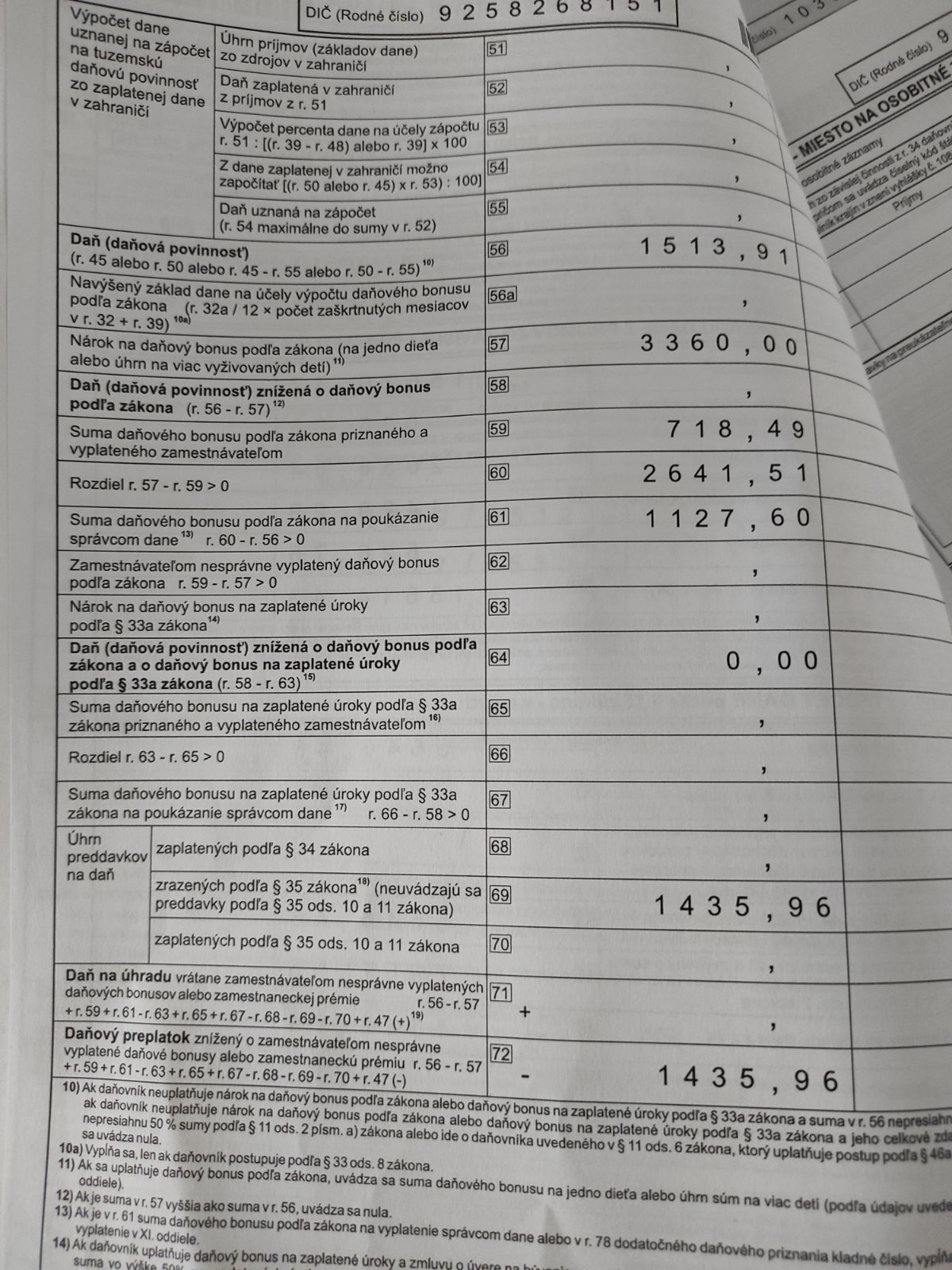 Bonus si mala 3360 narok, vyplatenych ti bolo 718 EUR. Mali by ti doplatit 2641 EUR. Ale odratali z toho dan 1514 EUR. Tym sa danova povinnost vyrovnala a vsetky zaplatene preddavky (kde je tiez volaco naviac zaplatene) ti vratia spolu s bonusom.