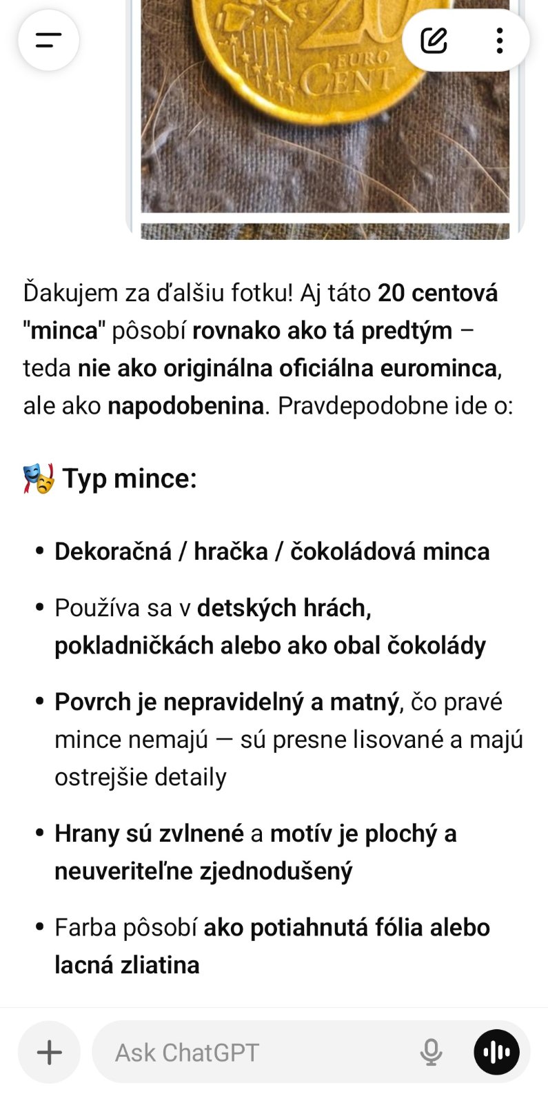 @simona20201309 ChatGPT nie je znalec, z jednej fotky nevie určiť pravosť mince. Pravdou je, že na fotke má divnú farbu, ale myslím, že to bude zlou fotkou.