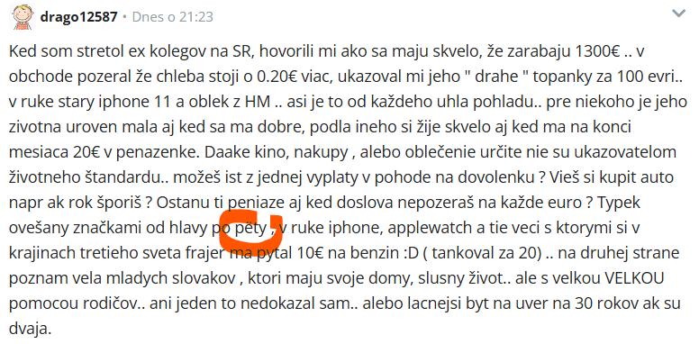 Ked som stretol ex kolegov na SR, hovorili mi ako sa maju skvelo, že zarabaju 1300€ .. v obchode pozeral že chleba stoji o 0.20€ viac, ukazoval mi jeho " drahe " topanky za 100 evri.. v ruke stary iphone 11 a oblek z HM .. asi je to od každeho uhla pohladu.. pre niekoho je jeho zivotna uroven mala aj ked sa ma dobre, podla ineho si žije skvelo aj ked ma na konci mesiaca 20€ v penazenke. Daake kino, nakupy , alebo oblečenie určite nie su ukazovatelom životneho štandardu.. možeš ist z jednej vyplaty v pohode na dovolenku ? Vieš si kupit auto napr ak rok šporiš ? Ostanu ti peniaze aj ked doslova nepozeraš na každe euro ? Typek ovešany značkami od hlavy po pëty , v ruke iphone, applewatch a tie veci s ktorymi si v krajinach tretieho sveta frajer ma pytal 10€ na benzin :D ( tankoval za 20) .. na druhej strane poznam vela mladych slovakov , ktori maju svoje domy, slusny život.. ale s velkou VELKOU pomocou rodičov.. ani jeden to nedokazal sam.. alebo lacnejsi byt na uver na 30 rokov ak su dvaja.