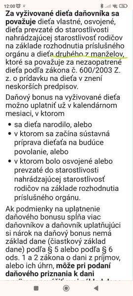 dieťa druhého z manželov, žijúce s ním v domácnosti, ktoré sa považuje za nezaopatrené dieťa v zmysle zákona č. 600/2003 Z. z. o prídavku na dieťa, pričom prechodný pobyt dieťaťa mimo domácnosti nemá vplyv na uplatnenie tohto daňového bonusu..