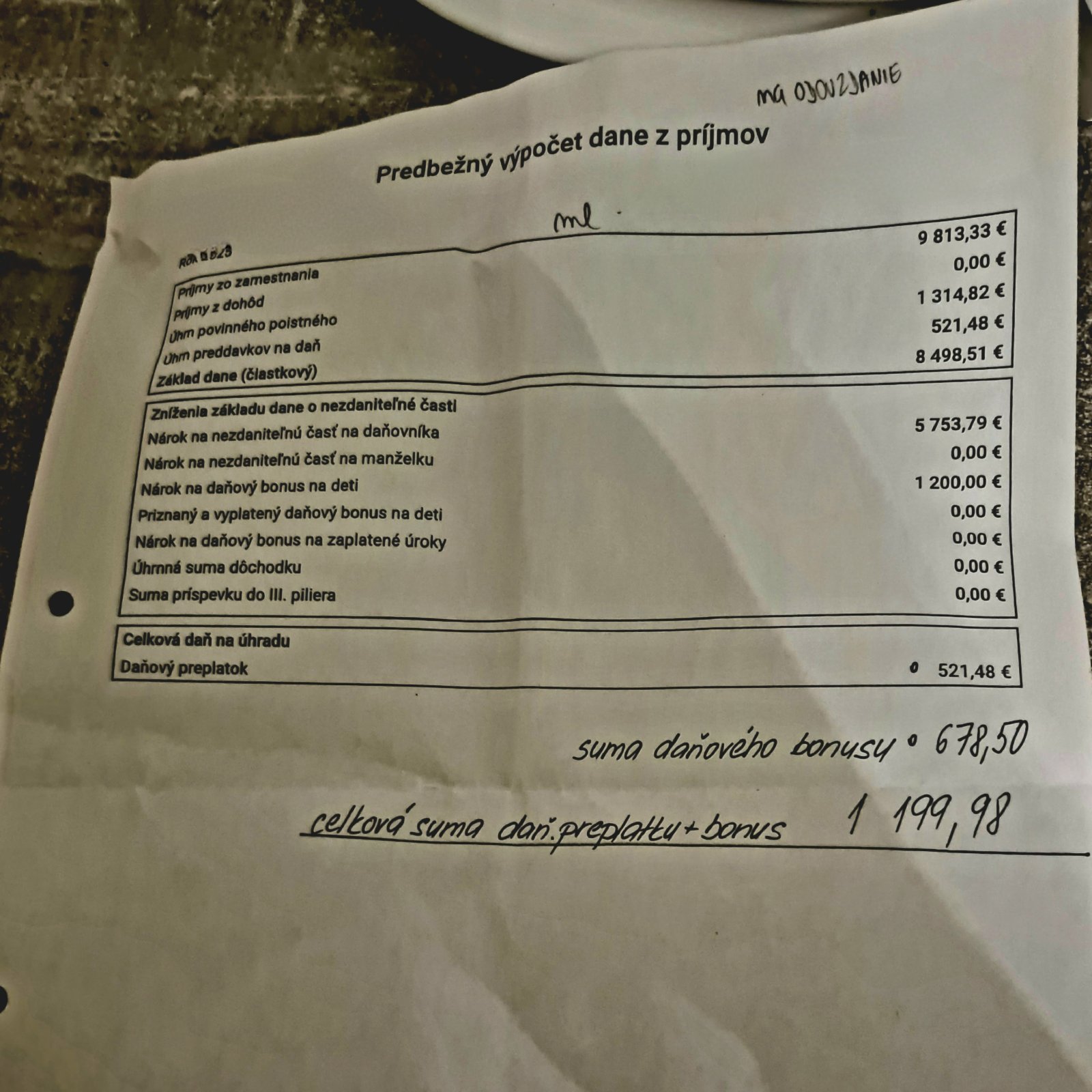 Zaplatené preddavky na daň: 521,48 eur (lebo bonus mi vynuluje daňovú povinnosť).