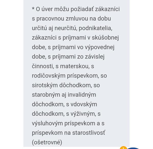 @doriiis pani prosím vás dakujem za tuto info viem ju aj bez vás ale dnes som volala infolinku a pán mi potvrdil že to čo majú na stránke je pravda stačí aj rodičák lenže záleží kolko by bola mesačná splátka orátaju mi či platím úver alebo čo ja viem čo a podla toho to schvaľujú. Žene ktorá je rozvedená a má 2 deti a rodičák plus nejaké splátky to určite nedajú.. ale teraz je skoro 500 eur aj s prídavkom a ak žena nič nespláca tak 30 eurovú splátku nemusí byt problém schváliť. Dali mi aj paušál s mobilom ktorý ma stoji 50 eur mesačne..