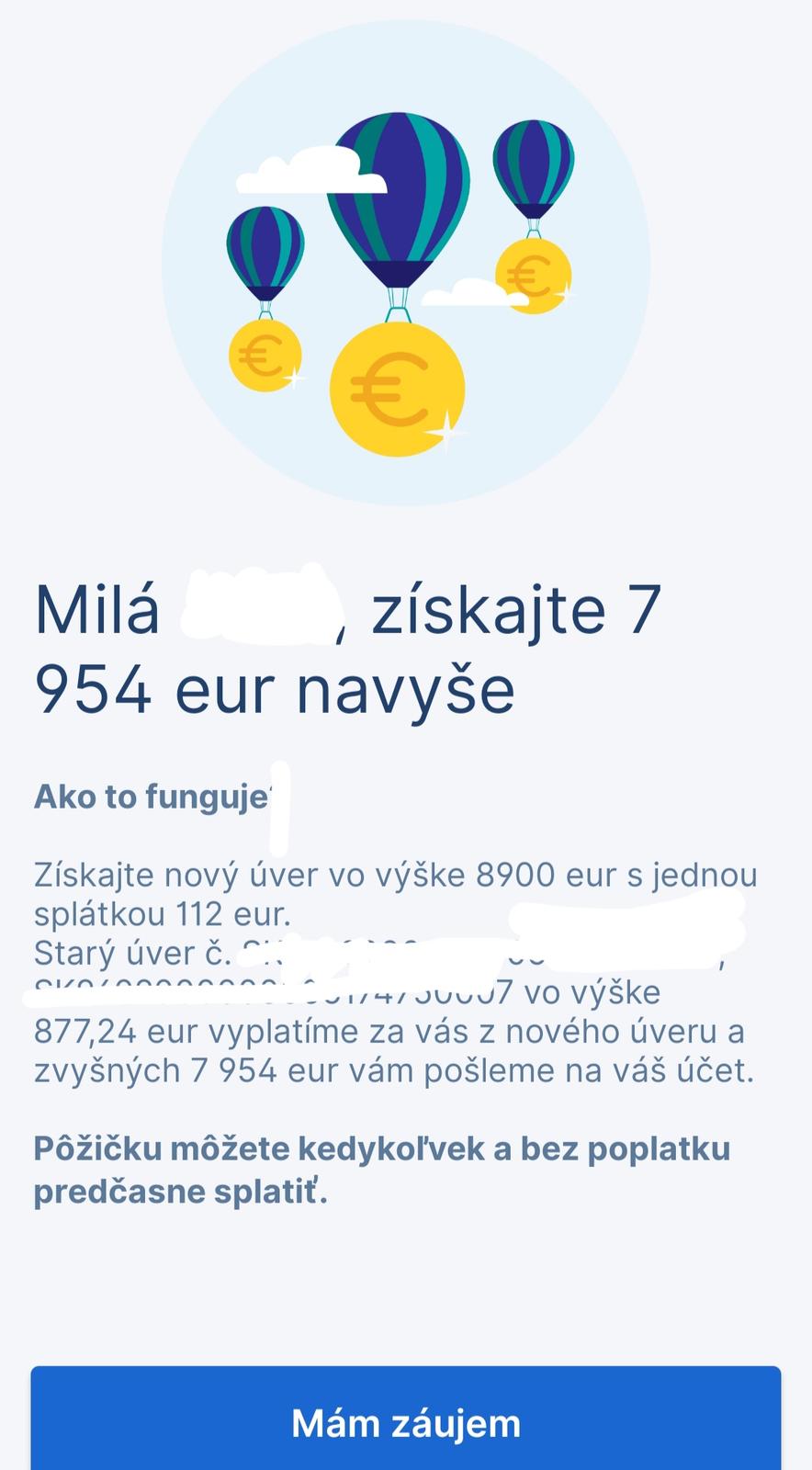 Je to normálne správanie finančnej inštitúcie. Ved žijú z poskytovania úverov (sú to ich aktívne operácie) a v systéme vidia, že mate už minimálny zostatok starého úveru. Chcú si Vás opäť udržať na ďalšie roky ako svojho klienta. Preto Vám prišla táto ponuka.