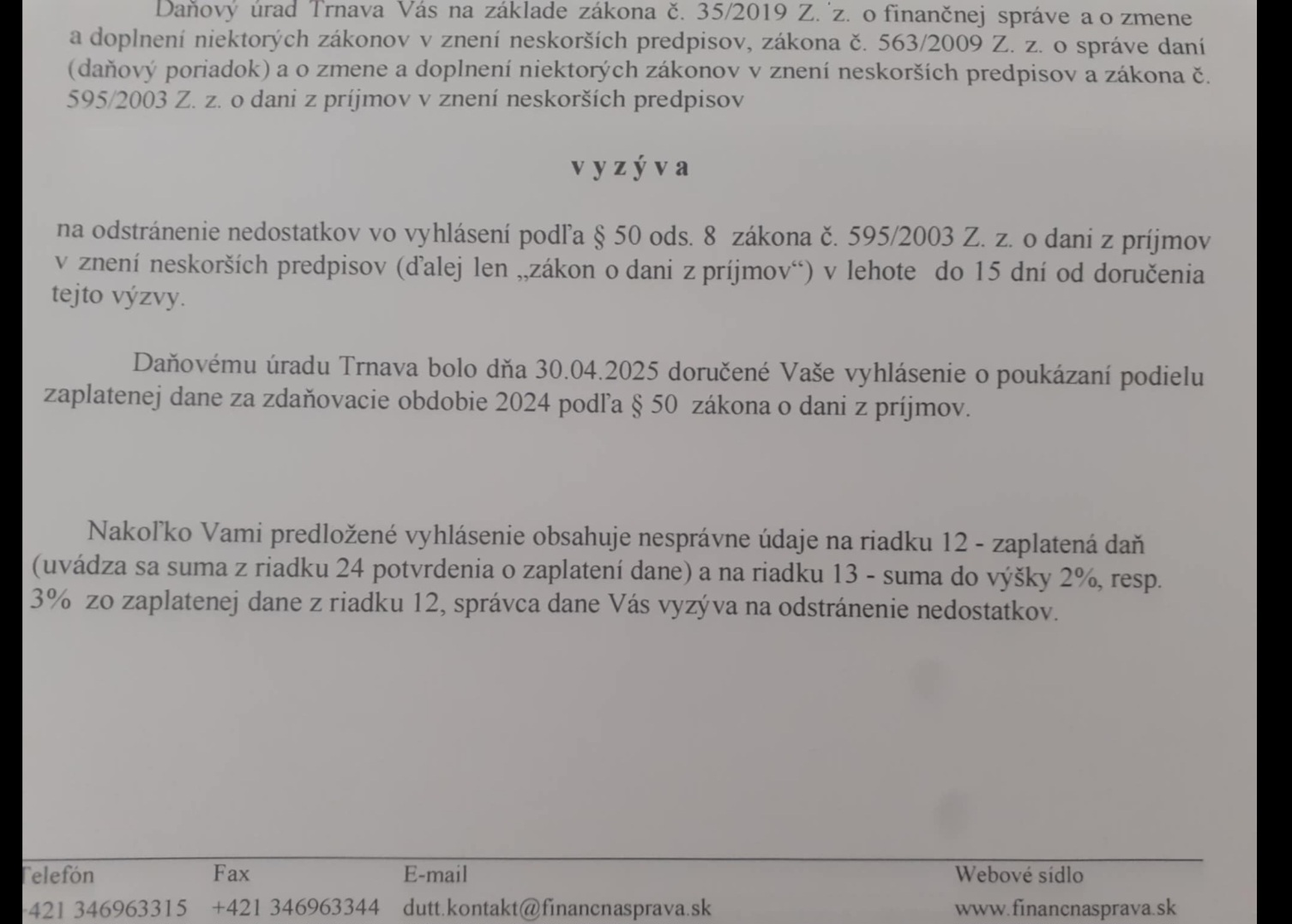 muž si bol dnes pre papier z DÚ. V ňom stálo, že ho vyzývajú na odstránenie nedostatkov, čo sa týka podaní 2 %. Samozrejme tam zajtra hneď zavolá, dnes sa už nedalo nikomu dovolať, preto sa obraciam tu, keďže vždy poradíte.