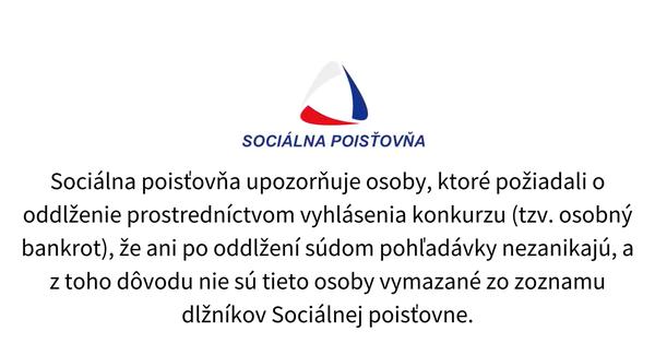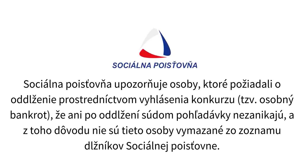Sociálna poisťovňa upozorňuje osoby, ktoré požiadali o oddlženie prostredníctvom vyhlásenia konkurzu (tzv. osobný bankrot), že ani po oddlžení súdom pohľadávky nezanikajú, a z toho dôvodu nie sú tieto osoby vymazané zo zoznamu dlžníkov Sociálnej poisťovne.