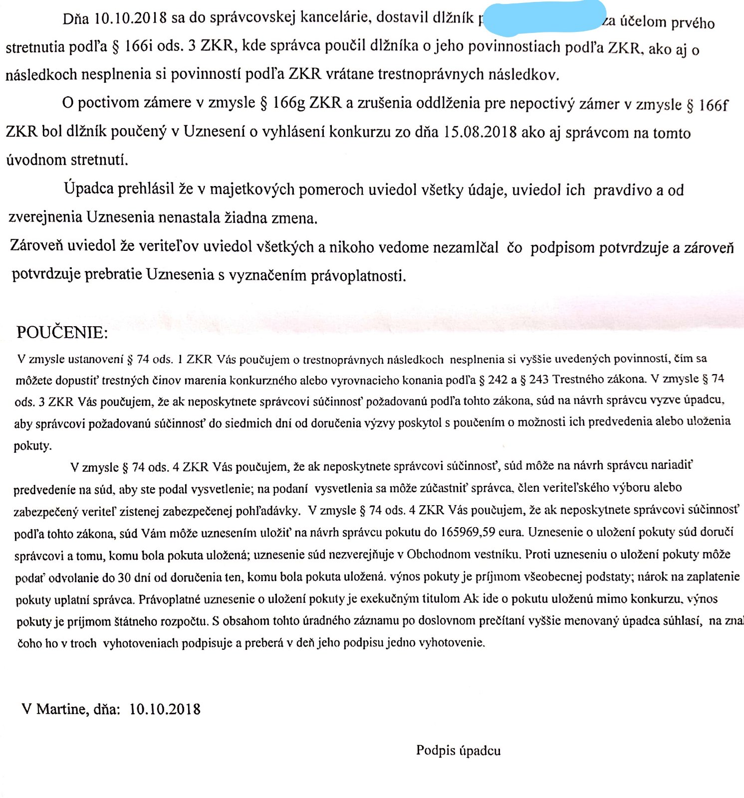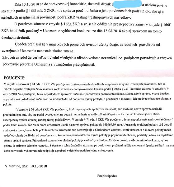 Ahojte, 23.8. 2018 som bol oddlžený, bol mi pridelený správca. Až teraz, po roku mi poslal správca Záznam z úvodného rokovania aj s právoplatným uznesením zo súdu. Travalo mu rok, kým vyvinul nejakú aktivitu, sám som ho emailom dopytoval aký bude postup cca pred 9 mesiacmi. V liste mi píše, že mám Záznam z rokovania podpísať, je tam dátum 10.10.2018. Prikladám tento záznam. Myslíte si, že je to v poriadku, podpisovať niečo s rok starým dátumom, kde sa píše, že som bol poučený na osobnom rokovaní, na ktorom som ani nebol, lebo ma správca vôbec nekontaktoval? Alebo to zbytočne komplikujem a mám to podpísať, lebo to chce mať správca z krku? Ďakujem.