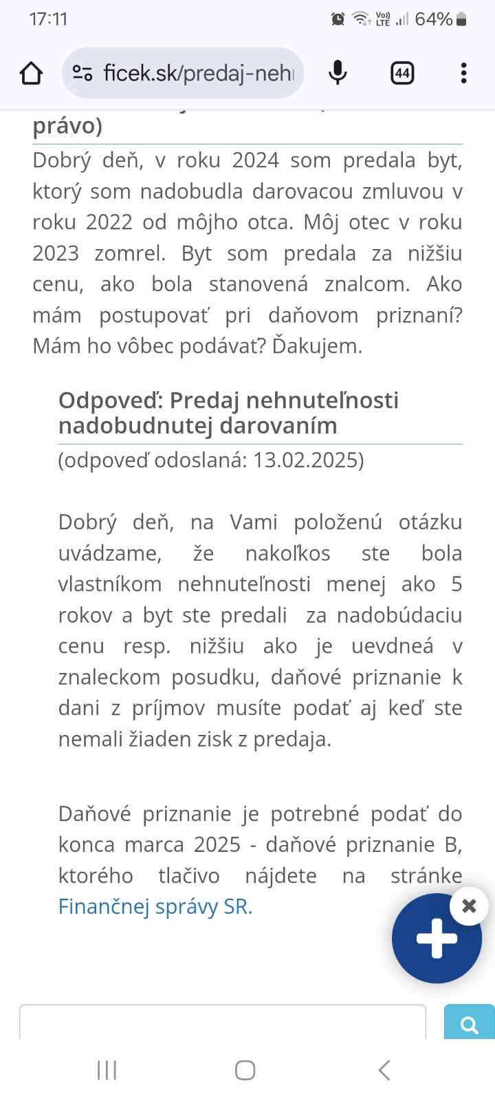 @katty123456 ty si nejako mimo. A áno aj z dedenej nehnuteľnosti v určitých prípadoch musíš platiť daň z príjmu z predaja nehnuteľnosti. Keby jej stará mama vlastnila nehnuteľnosť 2 roky a zomrela, a autorka by zdedila danú nehnuteľnosť a následne ju predala. Tak áno, je povinná platiť daň z príjmu z predaja nehnuteľnosti. A robí sa to tak, že pri dedičstve sa preto udáva aktuálna hodnota nehnuteľnosti v čase dedenia a potom, keď predá za drahšie ako nadobudla dedením, tak z rozdielu platí daň.