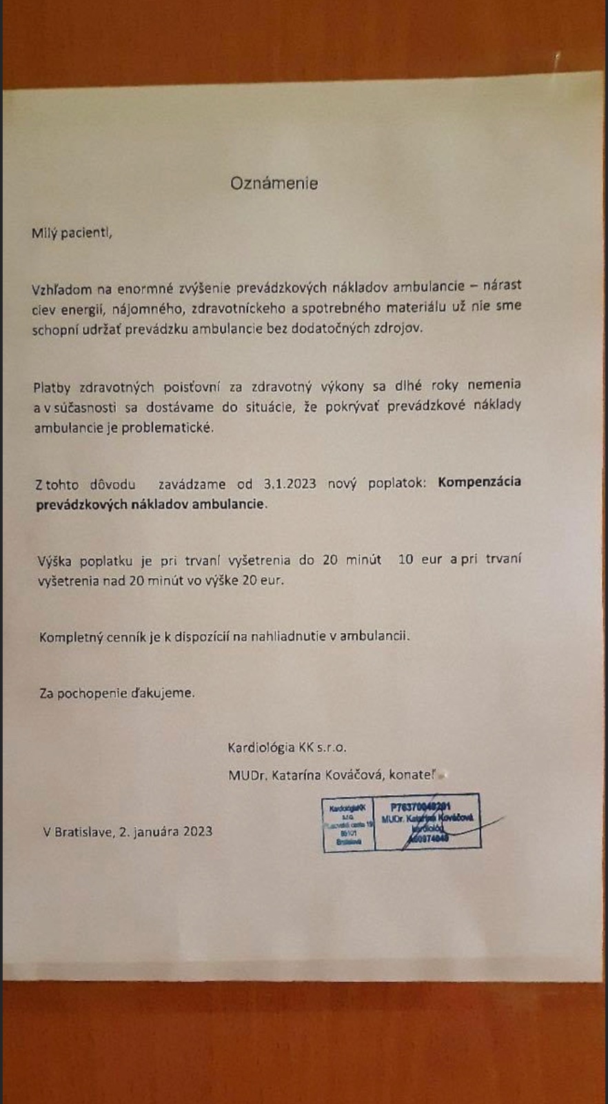 Pani doktorka tam prevádzkuje saunu s termálnymi bazénmi? Ani vtedy by mi ten poplatok nesedel. Veď keby len 10 pacientov denne vyšetrila, má 100 eur za poplatky vo vrecku. Vtipná je! Nech si dá pokladničku a tabuľku s prosbou o milodary. To by jej tam na to zvýšenie pacienti v drobákoch nahádzali. ;)