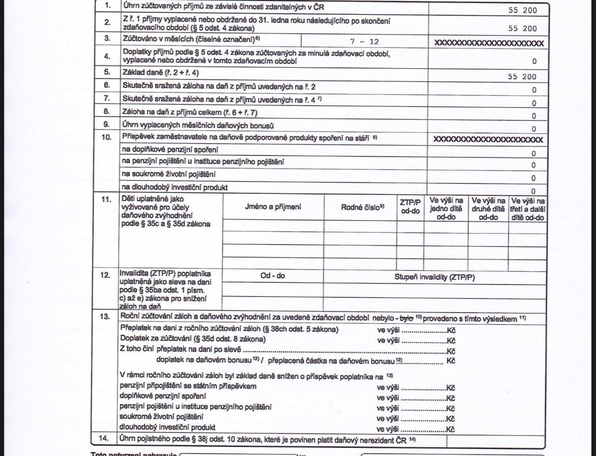 Pozri si potvrdenie o príjme ktoré ti poslali z Českej republiky. Ak tam máš zrazené preddavky na daň, tak si môžeš podať v Čechách daňové priznanie. Len pozor na to aby si účtovníčke nezaplatil viac ako ti štát vráti na dani. To sa ti potom neoplatí.