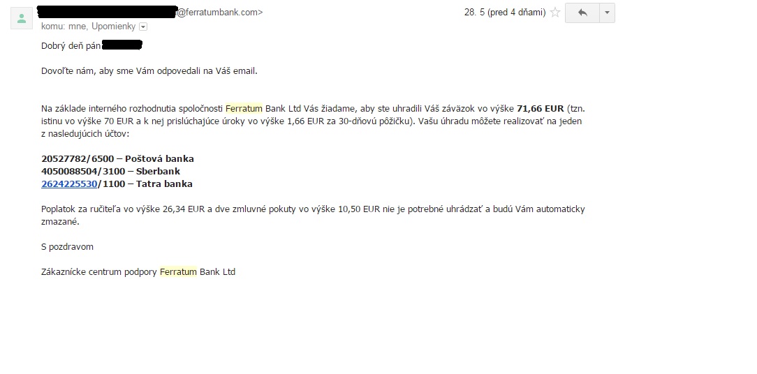 v každom pripade ak by som mal investovať do advokata peniaze, tak asi by som sa na to vykašlal a akceptoval to, že som tu požičku splatil-preplatil.