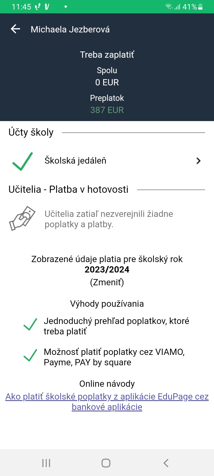 Dobrý deň prosím vás teraz som otvoril edupage a ukazuje mi tam nejaký preplatok za obed za minulý rok ale dcéra na obedy nechodila neviete prečo tam ma preplatok? Foto pošlem do správy