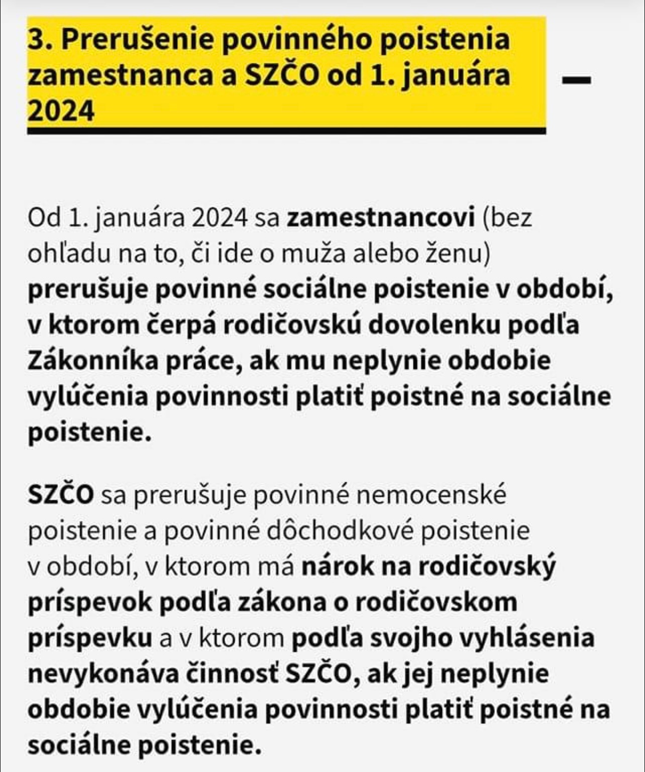 V nadväznosti na spresňujúcu úpravu vylúčenia povinnosti platiť poistné na nemocenské poistenie, dôchodkové poistenie a poistenie v nezamestnanosti zamestnancom alebo samostatne zárobkovo činnou osobou v súvislosti s tehotenstvom, pôrodom, starostlivosťou o dieťa a nárokom na materské od 1. januára 2024 je upravené aj prerušenie ich povinného poistenia.... bla bla